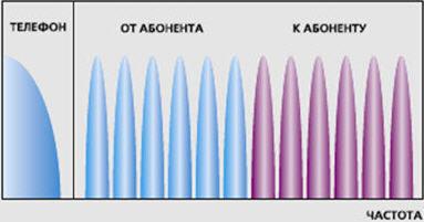 Технологія ADSL являє собою варіант DSL, в якому доступна смуга пропускання каналу розподілена між вихідним і вхідним трафіком несиметрично - для більшості користувачів вхідний трафік значно більше істотний, ніж вихідний, тому надання для нього більшої частини смуги пропускання цілком виправдано (винятками з правила є пірингові мережі , відеодзвінки та електронна пошта, де обсяг і швидкість вихідного трафіку бувають важливими). Звичайна телефонна лінія використовує для передачі голосу смугу частот 0,3 ... 3,4 кГц. Щоб не заважати використанню телефонної мережі за її прямим призначенням, в ADSL нижня межа діапазону частот знаходиться на рівні 26 кГц. Верхня ж межа, виходячи з вимог до швидкості передачі даних і можливостей телефонного кабелю, становить 1,1 МГц. Ця смуга пропускання ділиться на дві частини - частоти від 26 кГц до 138 кГц відведені вихідному потоку даних, а частоти від 138 кГц до 1,1 МГц - вхідному. Смуга частот від 26 кГц до 1,1 МГц була вибрана не випадково. Починаючи з частоти 20кГц і вище, загасання має лінійну залежність від частоти.