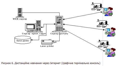 Перший - текстова консоль. Для цього може бути використовано протоколи TELNET або SSH. Telnet реалізовано як стандартний демон в UNIX (LINUX) системах і як сервіс в Windows XP/7 або Server 2003/2008. Під TELNET можна виконувати завдання із застосуванням таких засобів, як Borland Pascal, Borland C++ 3.0, GNU C++, SQL, а також розробляти учбові проекти на HTML, PERL, PHP і т.п. Для такого доступу стане досить помірної обчислювальної потужності - на одному сервері середнього рівня може виконуватися до 10-15 TELNET-сеансів. Мережевий трафік, який утворюють TELNET-сеанси, теж помірний - для нього вистачить пропускної здатності 9600 біт/с на кожний сеанс.