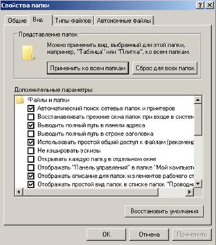 Выбрав в оконном меню папки пункт "Сервис>Свойства папки>Вид", можно настроить выдачу файлов таким образом, чтобы скрывать или, наоборот, отображать зарегистрированные типы файлов (рис. 6.3, б).