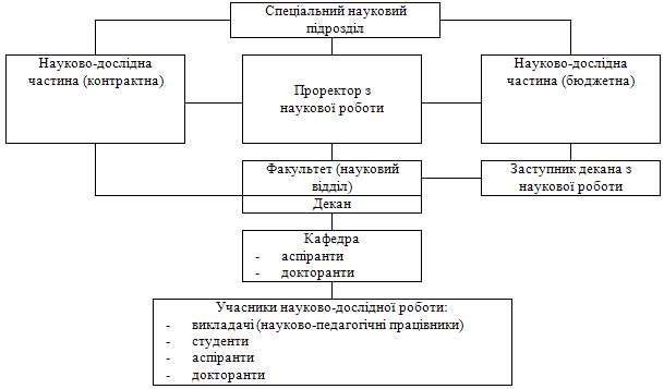 Люба діяльність може здійснюватися і функціонувати за умови певної її організації як системи, що об’єднує в одне ціле, упорядковане певними механізмами взаємодії. Організація науково-дослідної роботи вузу визначається передусім його статусом, рівнем акредитації, матеріально-технчною базою, кадровим потенціалом тощо. Схематично організацію науково-дослідної роботи у вищому навчальному закладі можна показати наступним чином: