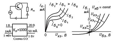 Схема включения с ОЭ обеспечивает усиление сигнала, как по напряжению, так и по току.