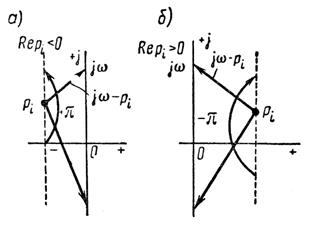 Корень pi лежит в левой полуплоскости (рисунок 2.2.2, а). При изменении w в пределах от -¥ до +¥ конец вектора