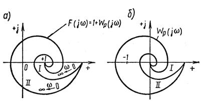 ; I соответствует устойчивой системе: он не охватывает точку (0, 0), II — неустойчивой: он охватывает точку (0, 0). Так как