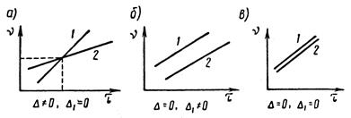 В первом случае точка пересечения прямых 1 и 2 определяет значения τ и ν для заданного значения ω; во втором случае прямые 1 и 2 параллельны и определяют значения τ и ν, равные бесконечности; в третьем случае прямые 1 и 2 сливаются друг с другом, и, таким образом, для заданного значения ω получается прямая, а не одна точка.