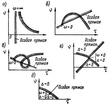 . В этом случае коэффициенты, соответствующие свободному и старшему членам характеристического уравнения, зависят от τ и ν, и для получения уравнений этих особых прямых необходимо указанные коэффициенты приравнять нулю. Первый коэффициент (свободный член) дает прямую для
