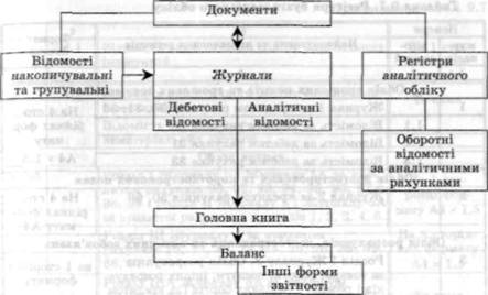 Схематично журнальну форму бухгалтерського обліку зображено на рис. Журнальна форма порівняно з попередніми має такі переваги: скорочується обсяг облікової роботи шляхом усунення проміжних облікових ланок (наприклад, складання меморіальних ордерів та їх реєстрації), уникнення багаторазовості й дублювання записів в облікові регістри; є певна регламентація порядку ведення обліку шляхом застосування журналів із заздалегідь надрукованим переліком кореспондуючих рахунків; прискорюється складання фінансової і податкової звітності, оскільки потрібна інформація міститься в журналах і їх відомостях.