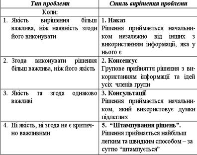- якщо ступінь довіри є низьким, тоді необхідно брати до уваги відразу два наступні фактори: потрібної якості рішення і ступеня згоди підлеглих виконувати рішення. Механізм вибору стилю прийняття рішення у цьому випадку описаний в табл.2.1.