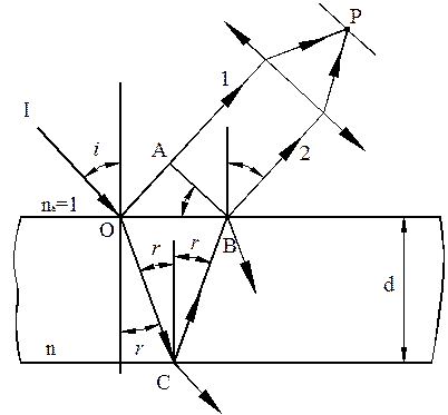 Падающая волна частично отражается от поверхности пленки (луч 1) и частично преломляется (луч OC). Преломленная волна, достигнув нижней поверхности пленки, отражается от нее (луч CB). Луч CB затем преломляется на верхней поверхности (луч 2). Лучи 1 и 2 с помощью линзы собираются на экране в точке