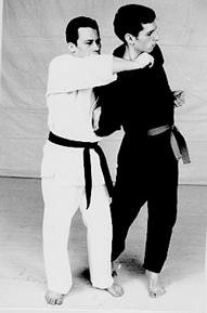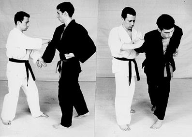 Противник толкает вас. Его прямые ноги стоят узко. Для выполнения приема захватываются рукава противника снизу, обратным захватом. Затем, выводя правой рукой левую руку противника влево-вперед от себя, левой рукой подтянуть его правую руку к себе. Одновременно поворачиваясь спиной к противнику, нужно подбить тазом его правое бедро и выполнить бросок (рис. 26).