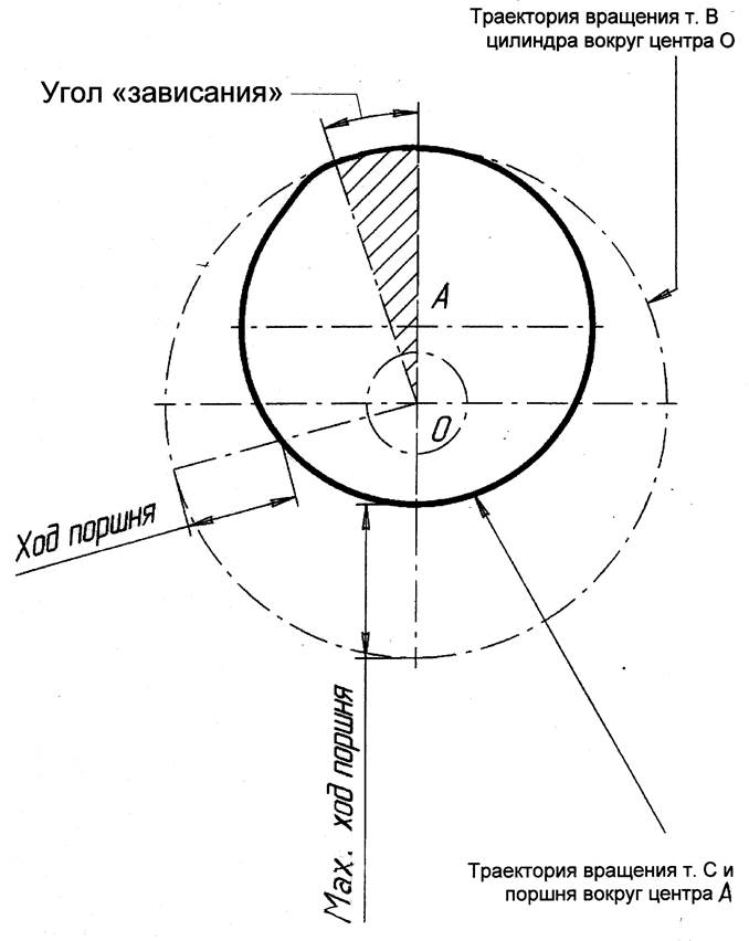 Фиг. 68. Одна из траекторий вращения поршня с участком «зависания» (неизменного постоянного объёма камеры сгорания) двухтактного