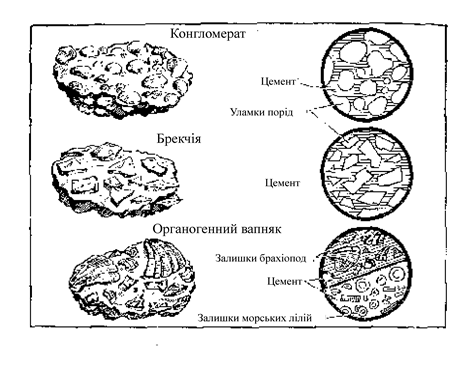 | Рис. 1.3.1. Структура магматичних (А), осадових (Б) та метаморфічних (В) порід |