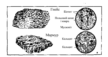 Структурою називають будову мінерального агрегату породи, тобто ступінь кристалізації мінералів, форму та розміри мінеральних зерен у породі. Так, за ступенем кристалізації виділяють повнокристалічну структуру (усі мінерали, що входять у породу, повністю перетворилися на кристали – граніт, мармур), порфирову (на загальній нерозкристалізованій масі виділяються кристали одного або кількох мінералів – порфирит, андезит), прихованокристалічну (кристали розрізняються лише під мікроскопом – базальт) та інші (рис.1.3.1,1.3.2). За розмірами кристалів розрізняють велико-, середньо- та дрібнозернисту структури.