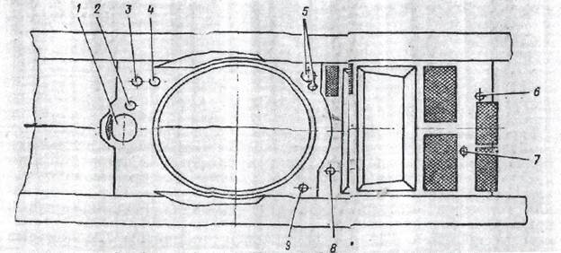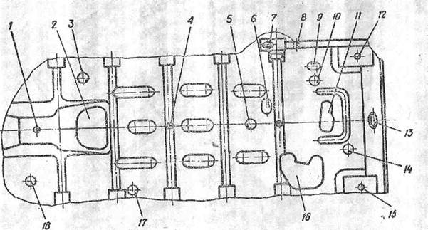 Люк механика водителя; 2-лючок для монтажа распределительной коробки навесного оборудования; 3 -лючок доступа к датчику топливомера; 4 - лючок доступа к заливной горловине внутренних топливных баков; 5 - отверстие для прохода воздуха к сепаратору нагнетателя; 6 - лючок доступа к заливной горловине пополнительного бака системы смазки двигателя; 7 - лючок доступа к заливной горловине радиатора; 8 -лючок доступа к расширительному бачку системы охлаждения; 9 - отверстие для выброса воды при преодолении водных преград