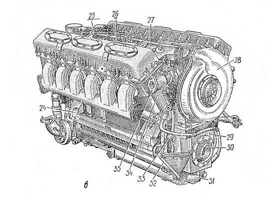 а - вид со стороны передач; 6 - вид со стороны носка коленчатого вала: 1 - крышка головки; 2 - головка блока; 3 - тяга привода насоса НК-12; 4 - топливный фильтр 1ФК-3; 5 - маслоотделитель системы вентиляции картера; 6 - воздухораспределитель; 7 - крышка лючка осмотра верхней передачи; 8 - трубы подвода охлаждающей жидкости к рубашкам блоков цилиндров; 9 - крышка центрального подвода масла к двигателю; 10 - водяной насос: 11 - штуцер слива охлаждающей жидкости; 12 - трубопровод от масляного насоса к фильтру МАФ; 13 - масляный насос; 14 - масляный насос системы вентиляции картера; 15 - трубопровод подвода масла от фильтра МАФ к крышке центрального подвода масла к двигателю; 16 - топливоподкачивающии насос АГР-896-Ч; 17 — трубопровод от масляного насоса к МЦ-1; 18 - трубка подвода топлива от АГР-896-Ч к ТФК-3; 19 - привод электротахометра; 20 - трубопровод системы вентиляции картера; 21 - нижняя половина картера; 22 - трубопровод от масляного фильтра МАФ к нагнетателю; 23 - выпускной коллектор; 24 - лапа крепления двигателя; 25 - топливная трубка высокого давления; 26 - топливный насос высокого давления НК-12М: 27 - впускной коллектор; 28 - нагнетатель Н-24; 29 - верхняя половина картера; 30 - носок коленчатого вала; 31 - патрубок слива из МЦ-1; 32 - трубка обогрева нижнего картера: 33 - трубка обогрева верхнего картера; 34 - рубашка цилиндров; 35 - угольник выхода охлаждающей жидкости из головок двигателя.
