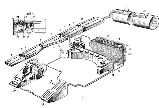 В систему питания топливом входят: внутренние топливные баки 3, 18, 19 и 20, наружные топливные баки 1, 2, 4, 6 и 10, расширительный бачок 8, поплавковый клапан 9, топливораспределительный кран 23, кран 7 отключения наружных топливных баков, ручной топливоподкачивающий насос 25, топливные фильтры 26 грубой и 15 тонкой очистки, топливоподкачивающий насос 17, бензиновый центробежный насос 24, топливный насос 13 высокого давления НК-12М и клапан 21 выпуска воздуха, сливной штуцер 22 откачки топлива насосом БЦН-1, форсунки 14, электрические емкостные топливомеры ИТ2-1С, ИТЗ-1С, трубопроводы высокого и низкого давления. С помощью специального оборудования к системе питания топливом подсоединяются бочки Л и 12.