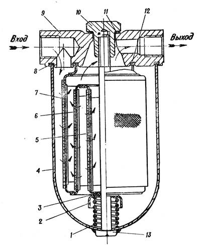 1 - пружина; 2 - кольцо; 3 - прокладка; 4 - стакан; 5, б и 7 - фильтрующие секции; 8 - прокладка; 9 - крышка; 10 - гайка; 11 и 12 - прокладки; 13 – болт.