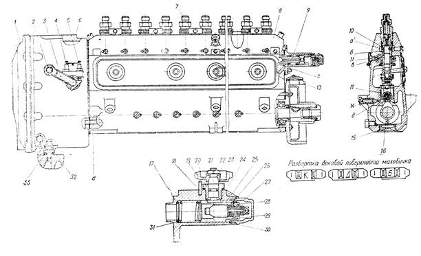 1 - крышка регулятора: 2 - сферический подшипник; 3 - рычаг регулятора; 4 и 5 - регулировочный винты; 6 - корпус регулятора; 7, 32 - штуцера; 8 - корпус насоса; 9 - зубчатая рейка; 10 - гильза плунжера; 11 - зубчатый венец; 12 - толкатель; 13 - букса; 14 - штуцер; 15 - пробка; 16 - кулачковый валик; 17 - корпус ограничителя максимальной подачи топлива; 18 - штифт; 19 - маховик; 20 - втулка фиксатора; 21 - гайка; 22, 23, 30, 33 - кольца (уплотнительные); 24 - валик фиксатора; 25 - гильза; 26 - упор; 27 - колпачок; 28 - шарик; 29 - кольцо (пружинное); 31 - пружина; а - полость; б - сверление; в - канавка; г, д, е - отверстия.