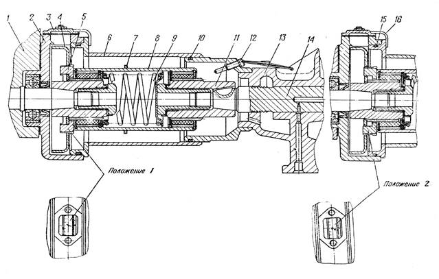 1 - корпус топливного насоса; 2 - букса; 3 - крышка; 4 - маховик со шлицевой втулкой; 5 - шайба с упорами; 6 - кожух с фланцами; 7 - кольцо; 8 - муфта привода; 9 - пружина; 10 и 15 - уплотнительные кольца; 11 - втулка привода; 12 - стопорный винт; 13 - корпус привода топливного насоса; 14 - валик привода топливного насоса; 16 – планка.