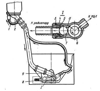 По мере расхода масла двигателем масло из пополнительного бака 9 по трубопроводу поступает в основной бак 5. Для предотвращения перелива масла из основного бака в пополнительный на подъемах в пополнительном баке имеется обратный клапан 11.