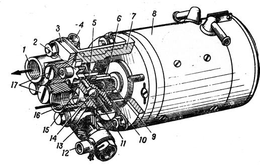 Если давление в корпусе клапана достигает 6 кгс/см2, то клапан открывается, и часть масла дополнительно перепускается в штуцер к радиаторам и в бак. Меньшая часть масла иод давлением, поддерживаемым редукционным клапаном, поступает к центробежному фильтру и по каналам в корпусе фильтра и стержня попадает в рабочую полость ротора. Затем масло проходит через щелевые фильтры стальных трубок и поступает к соплам. Вытекая из сопел в виде двух противоположно направленных струй, масло создает реактивный момент, который вращает ротор вместе с находящимся в нем маслом.