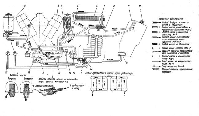 1 — указатель температуры масла; 2 — масляный фильтр МАФ; 3 — двигатель 4— масляный центробежный фильтр МЦ-1; 5 — дренажный трубопровод; 6 — масляные радиаторы; 7 — перепускной клапан 8 — основной маслобак; 9—пополнительный маслобак; 10 — заправочная горловина; 11 — обратный клапан (предотвращает перелив масла из основного маслобака в пополнительный); 12— заборный фильтр; 13 — маслозакачивающий насос МЗH-2; 14— датчик манометра; 15— датчик термометра; 16 — масляный насос двигателя; 17 — указатель давления масла; 18 — клапан слива масла