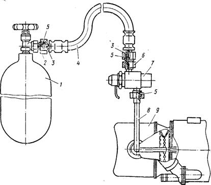 1 - баллон с воздухом; 2 - переходник; 3 - прокладка 10X16; 4 - шланг; 5 - прокладка 12X18; 6 - муфта; 7 - клапан; 8 - трубка; 9 - головка подогревателя