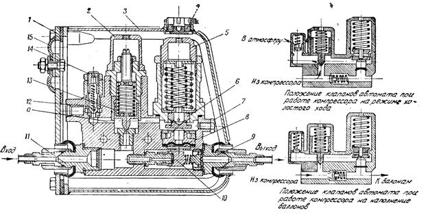 На кожухе имеется резиновый клапан 15, предназначенный для выпуска воздуха во время работы компрессора на холостом ходу, и пробка 4 для продувки автомата давления при нарушении его нормальной работы.