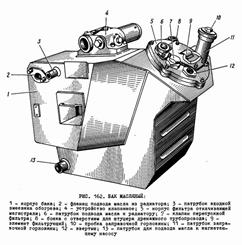 1-корпус бака; 2-фланец подвода масла из радиатора; 3-патрубок входной змеевика обогрева; 4-устройтсво клапанное; 5-корпус фильтра откачивающей магистрали; 6-патрубок подвода масла к радиатору; 7-клапан перепускной фильтра; 8-бонка с отверстием для штуцера дренажного трубопровода; 9-элемент фильтрующий; 10-пробка заправочной горловины; 11-патрубок заправочной горловины; 12-ввертыш; 13-патрубок для подвода масла к нагнетающему насосу