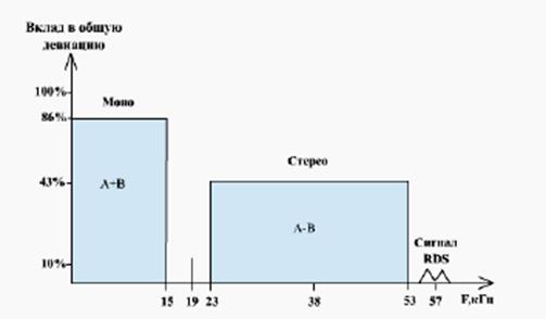 Передача данных, основанная на уплотнение сигнала вещательной станции, работающей в FM и УКВ диапазонах, получила название протокола RDS и была внедрена в начале 90-х годов в качестве многофункционального формата передачи данных, как на адресные, так и на безадресные приемники. Здесь частотно - модулирующий сигнал RDS замешивается в комплексный стереосигнал на поднесущей частоте 57 кГц с девиацией +- 2 кГц. Результирующий спектр сигнала приведен на рис. 17, где А и В - сигналы левого и правого каналов стереовещания.