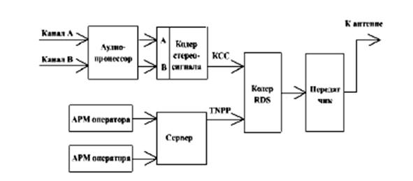Зона покрытия RDS пейджинга при эксплуатации наиболее широко распространенных RDS - пейджеров Nokia, Infotelecom, Matador на 10 - 20% меньше зоны устойчивого приема самой вещательной станции и имеет, как правило, радиус в несколько десятков км. Для выравнивания зон вещания и RDS пейджинга, а также уменьшения ошибок при передаче пейджинговых сообщений, обусловленных взаимным влиянием спектра вещательного и RDS сигналов, в передающий тракт включает аудиопроцессор (рис.19).