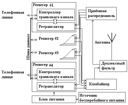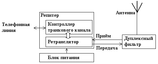 Репитер состоит из ретранслятора, предназначенного для приёма сигналов абонентских радиостанций, его усиления и передачи, и контроллера транкового канала, который выполняет управляющие функции.