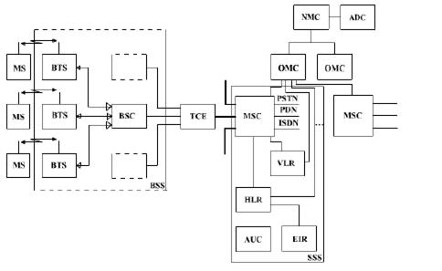 Здесь MSC (Mobile Ststion) - центр коммутации подвижной связи, BSS (Base Station System) - оборудование базовой станции, OMC (Operations and Maintenance Centre) - центр управления и обслуживания MS (Mobile Stations) - подвижные станции.