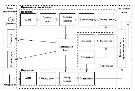 Приемопередающий блок состоит из передатчика, приемника, синтезатора частот и логического блока.