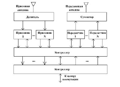 Одноименные приемники и передатчики имеют общие перестраиваемые опорные генераторы, обеспечивающие их согласованную перестройку при переходе с одного канала на другой. Конкретное число N приемопередатчиков на одну приемную и N передатчиков на одну передающую антенну. Между приемной антенной и приемниками устанавливается делитель мощности на N выходов, а между передатчиками и передающей антенной - сумматор мощности на N входов.