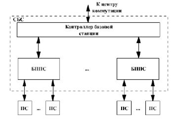 В стандарте GSM используется понятие системы базовой станции (СБС), в которую входит контролер базовой станции (КБС) и несколько (например, до шестнадцати) базовых приемопередающих станций (БППС - рис. 34). В частности, при БППС, расположенные в одном месте и замыкающиеся на общий КБС, могут обслуживать каждый свой 120 - градусный азимутный сектор в пределах ячейки или шесть БППС с одним КБС - шесть 60-градусных секторов. В стандарте D-AMPS в аналогичном случае могут использоваться соответственно три или шесть независимых БС, каждая со своим контролером, расположенных в одном месте и работающих каждая на свою секторную антенну.