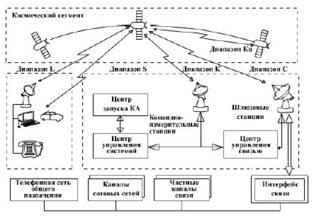 - наземный сегмент - включающий центр управления системой, центр запуска КА, командно - измерительные станции, центр управления связью и шлюзовые станции;