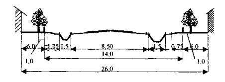 Для каждой улицы разрабатывают поперечный профиль – изображение улицы в вертикальном разрезе перпендикулярно ее оси. На профиле показывают размещение и размеры всех составляющих улицу элементов. Поперечный профиль дает представление не только о горизонтальном расположении и размерах элементов улицы, но и о ее высотной организации. Такой профиль называют архитектурным. Он дополняет начертание улицы в плане, показывая ее пространственный вид и раскрывая архитектурный облик улицы (рисунок 2).