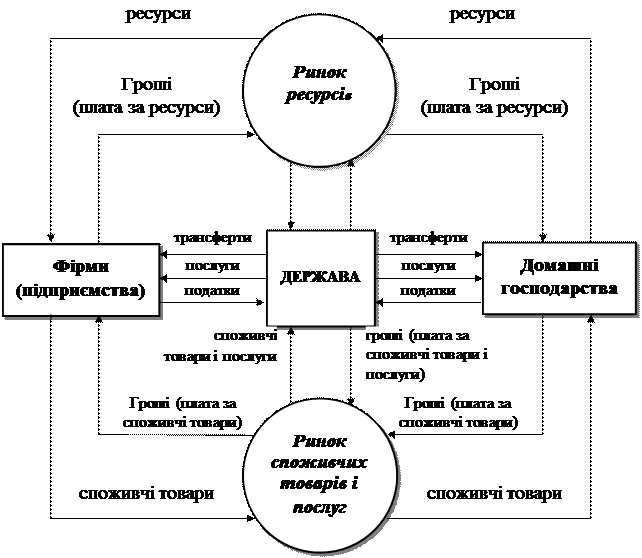 1. Пропозиція ресурсів домогосподарствами (жирна стрілка 1) на ринку ресурсів. Від продажу ресурсів домогосподарства отримують доходи (пунктирна стрілка) у формі заробітної плати, ренти, процента, прибутку