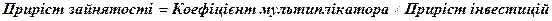 Особлива роль ним відводиться інвестиціям, які, по-перше, створюють “первинну” зайнятість робочої сили, і, по-друге, ці додаткові робітники, пред’являючи додатковий попит на предмети споживання, необхідність і можливість виробництва яких створюють “вторинну” зайнятість. В результаті подальшої ланцюгової реакції з’являється ефект мультиплікатора зайнятості: