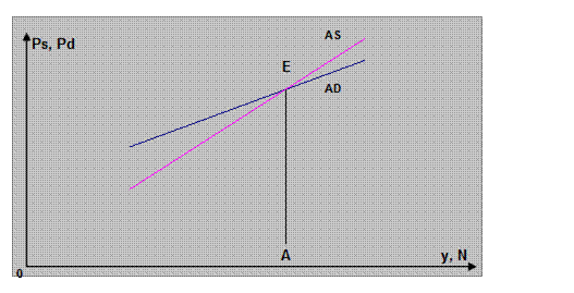 Відкладемо на осі абсцис реальний дохід або величину зайнятості (y, N). Ці змінні взаємозв’язані через виробничу функцію. На осі ординат відкладемо значення Ps і Pd – ціни пропозиції і попиту. Економічний зміст ціни пропозиції відомої кількості продукту ( або праці) полягає в тому, що вона відображає очікування підприємцями такої виручки, яка б підштовхнула бізнес до початку виробництва продукції (або до купівлі праці). Взаємозв’язок ціни сукупної пропозиції з обсягом національного доходу (або праці) Дж. М. Кейнс назвав функцією сукупної пропозиції. Ця функція на малюнку 5.5 представлена лінією AS. Лінія AS в короткотерміновому періоді об’єктивно задана наявними технологіями і виступає як деяка константа.