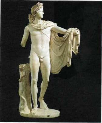 живых человеческих существ, но все же - существ иного, лучшего мира. Они и в самом деле принадлежат возвышенному миру, но не потому, что греки были здоровее и красивее других народов - нет основания для такого предположения, - но потому, что их искусство достигло в своем развитии такой точки, где типичное и индивидуальное пребывают в тонко сбалансированном соответствии. Многие из прославленных произведений классики, признанных позднее совершеннейшими образцами человеческой красоты, являются лишь копиями или вариантами статуй середины IV века. Аполлон Бельведерский (илл. 64) считается идеалом мужской красоты. Бог стоит перед нами в эффектной позе, отведя в широком движении руку, сжимающую лук, его голова повернута в сторону, словно он следит за полетом пущенной стрелы. Во всем этом нетрудно различить изначальный канон, прием развертывания частей тела по наиболее характерным позициям. Венера Милосская (названная так потому, что она была найдена на острове Мелос, илл. 65) - известнейшая из всех античных Венер.