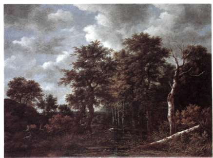 Картины таких художников, как Ян Стен, нередко определяют наше представление о голландской живописи как жизнелюбивом и радостном искусстве. Но в ней звучали и совсем иные тональности, близкие рембрандтовской сумрачности. Таким настроением проникнуты пейзажи выдающегося мастера этого жанра Якоба ван Рейсдала (1628/1629 - 1682). Рейсдал, как и Ян Стен, принадлежал ко второму поколению голландских живописцев. В период созревания его таланта и Ян ван Гойен, и Рембрандт были уже знаменитыми мастерами, под влиянием которых сформировался его вкус и определилась тематика. Первую половину жизни он провел в красивом городе Харлеме, отделенном от моря грядой лесистых дюн. Он любил зарисовывать эти виды с их чередованиями света и тени и с годами стал специалистом по лесному пейзажу (илл. 279). Рейсдал писал небо, мрачнеющее в густых облаках, тени, нарастающие при вечернем освещении, полуразрушенные замки, быстрые ручьи, - одним словом, он погрузился в поэзию северной