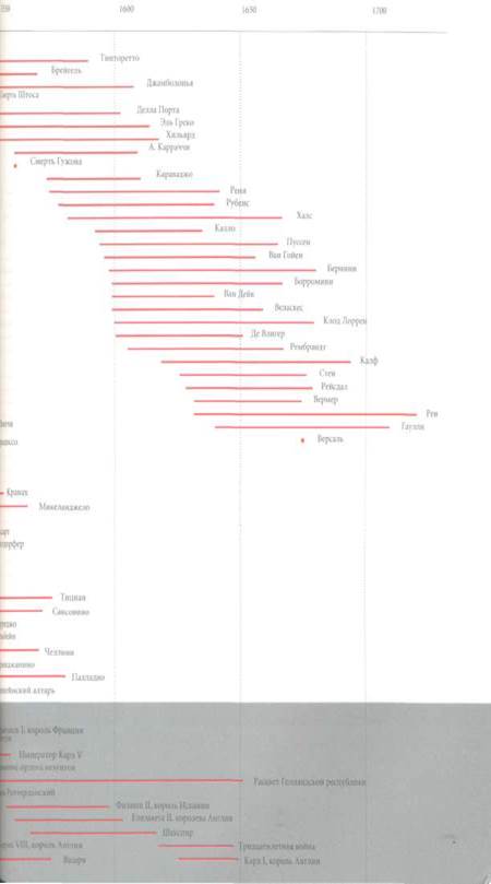 Следующие три таблицы (II—IV) освещают последние двадцать пять столетий более детально. Необходимо учитывать иной масштаб обозначения времени для ближайших к нам 650 лет. В них включены только упоминавшиеся в тексте художники и произведения. То же самое, за немногими исключениями, относится к выборке событий и персонажей, представленных в нижней части каждой таблицы. Во всех таблицах серым цветом обозначены исторические отрезки.