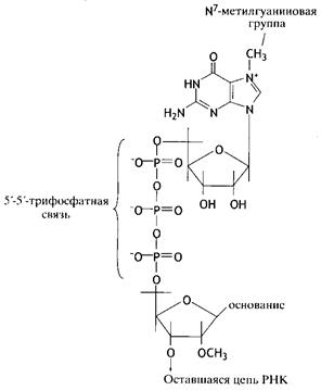 Зрелая мРНК содержит 5/- и 3/-концевые нетранслируемые последовательности, длина которых варьирует у разных мРНК. На 5/-конце имеется «кэп»-структура (метилированный по 7/-положению гуанозин, связанный 5/,5/-трифосфатной связью со следующим основанием); на 3/-конце находится поли А-«хвост», содержащий от 20 до 250 нуклеотидов (рис. 10).