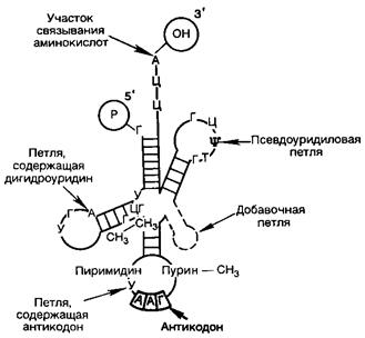 тРНК низкомолекулярны (мол.м. около 25000). На долю тРНК приходится 10-15% от общего количества тРНК. Основная функция тРНК – связывание соответствующих аминокислот и перенос их на рибосому с помощью фермента аминоацилсинтетазы. Для каждой аминокислоты существует специфическая аминоацилсинтетаза и тРНК. В настоящее время открыто около шестидесяти различных тРНК (для ряда аминокислот имеется более одной). Аминокислота присоединяется к свободной 3/ ОН-группе. Все тРНК обладают сходной структурой и напоминают клеверный лист (рис. 11).