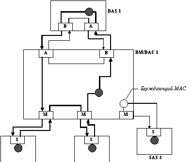 Концентратор DM/DAC1 имеет два MAC-узла: один участвует в нормальной работе первичного кольца, а второй, локальный, присоединен к пути, соединяющему порт M со станцией SAS3. Этот путь образует изолированное кольцо и используется для локальной проверки работоспособности и параметров станции SAS3. Если он работоспособен и его параметры не требуют реинициализации основной сети, то станция SAS3 включается в работу первичного кольца "плавно" (smooth-insertion).