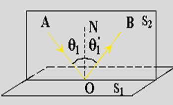| S1 - поверхня відбивання; S2 - площина падіння; АО - падаючий промінь; ОВ - відбитий промінь; ON - нормаль до поверхні. |