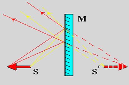 Дійсне джерело та його зображення розташовані симетрично відносно дзеркала. Спостерігачеві здається, що відбиті промені виходять з точки S', розташованої за дзеркалом симетрично точці S.
