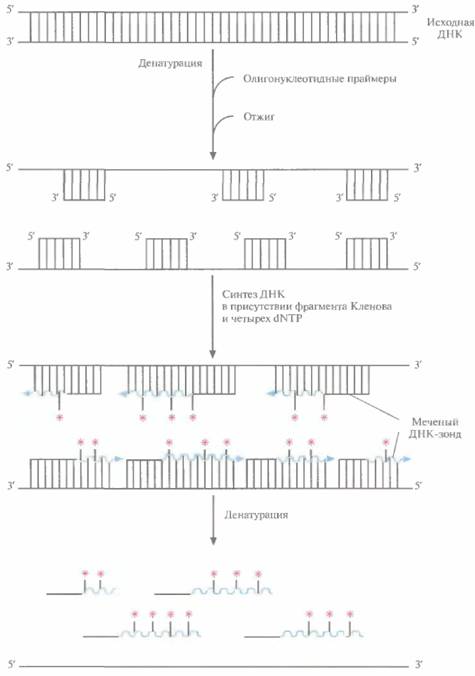 | Рис. 4.12. Получение меченого ДНК-зонда методом случайных праймеров. К денатурированной двухцепочечной ДНК, содержащей нуклеотидную последовательность, которую предполагается использовать в качестве зонда, добавляют гексануклеотиды (смесь всех возможных комбинаций из шести нуклеотидов) и отжигают смесь. Некоторые из олигонуклеотидов гибридизуются с немеченой денатурированной ДНК, и в присутствии фрагмента Кленова и четырех dNTP (один из которых меченый [*]) служат затравкой для синтеза комплементарной цепи. После денатурации синтезированной ДНК получают смесь меченых фрагментов ДНК, которые вместе составляют практически полноразмерную исходную ДНК-матрицу. |