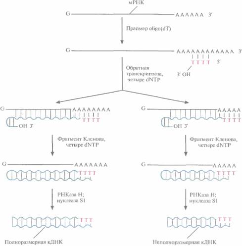 Саму мРНК нельзя встроить в ДНК-вектор, сначала на ней необходимо синтезировать двух-цепочечную ДНК, Для этого последовательно используют две разные полимеразы: обратную транскриптазу и фрагмент Кленова ДНК-поли-меразы I (рис. 4.15). Вначале в реакционную смесь с очищенной мРНК добавляют короткие oligo(dT), обратную транскриптазу и четыре dNTP (dATP, dTTP, dGTP, dCTP). Ро1у(А)-хвост мРНК спаривается с oligo(dT), несушим свободную 3'-ОН-группу, которая инициирует синтез комплементарной цепи. Матрицей в этом синтезе служит молекула мРНК, а катализирует его обратная транскриптаза, продуцируемая некоторыми РНК-вирусами. Она последовательно присоединяет к растущей цепи остатки Т, С, G или А, комплементарные A, G, С или U мРНК. In vitro синтез ДНК идет не до конца, при этом обратная транскриптаза перед остановкой обычно «поворачивает вспять» и присоединяет несколько нуклеотидов в обратном направлении (рис. 4.15), так что в результате образуется «шпилька».